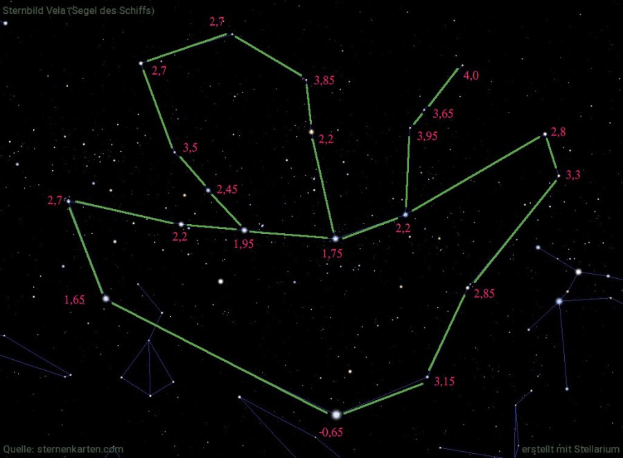 Unten im Kiel des Schiffs befindet sich nämlich ein -0,65 mag heller Stern. Canopus heißt dieser Stern. Er ist der zweithellste Stern, den es am gesamten Nachthimmel gibt und fällt deshalb sofort ins Auge.