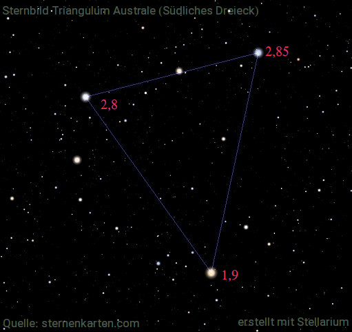 Gleich neben Alpha Centauri befindet sich auf der Milchstraße das Sternbild Zirkel. Führen wir die Bewegung weiter, so landen wir im Sternbild Südliches Dreieck.