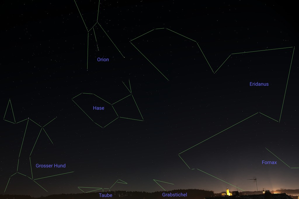 Ganz so auffällig ist es nicht, das Sternbild Taube. Das liegt aber vor allem daran, daß es als Sternbild des Südhimmels bestenfalls teilweise über den Horizont kommt. Möchte man es erkunden, so ist es am besten, unter den Hinterfüßen des Großen Hundes nachzuschauen. Und den Großen Hund wird man erahnen können, beherbergt er doch mit Sirus den hellsten Stern, den es am Himmel gibt.
