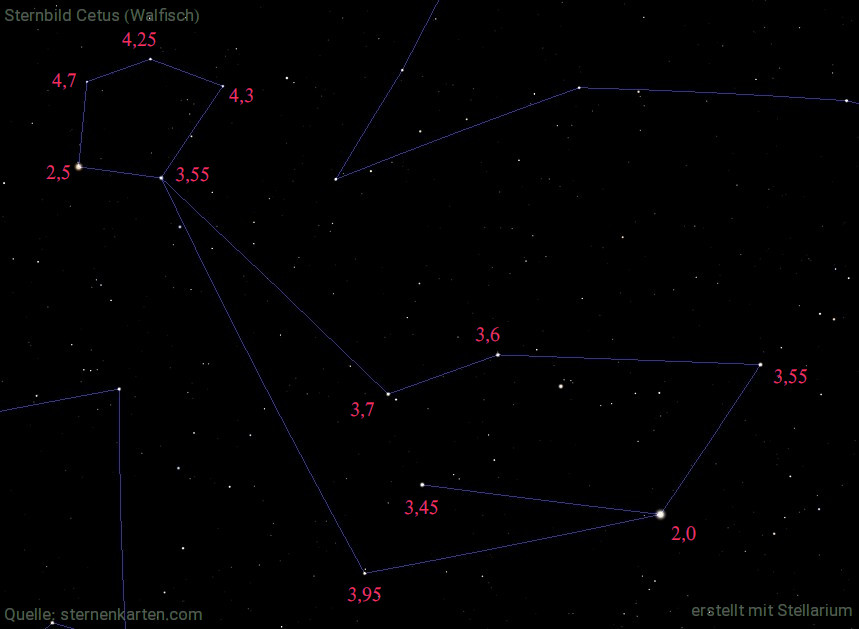 Das Sternbild Walfisch ist ein ausgedehntes Sternbild. Leider hat es nicht genügend helle Sterne, um als Sternbildfigur sofort ins Auge zu springen. Es hilft aber ein wenig, sich in einer dunklen Nacht ein wenig in diese Sternenregion zu vertiefen.