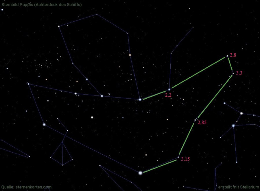Die scheinbaren Helligkeiten der Sterne sind im Bild rot markiert und in Magnituden angegeben.