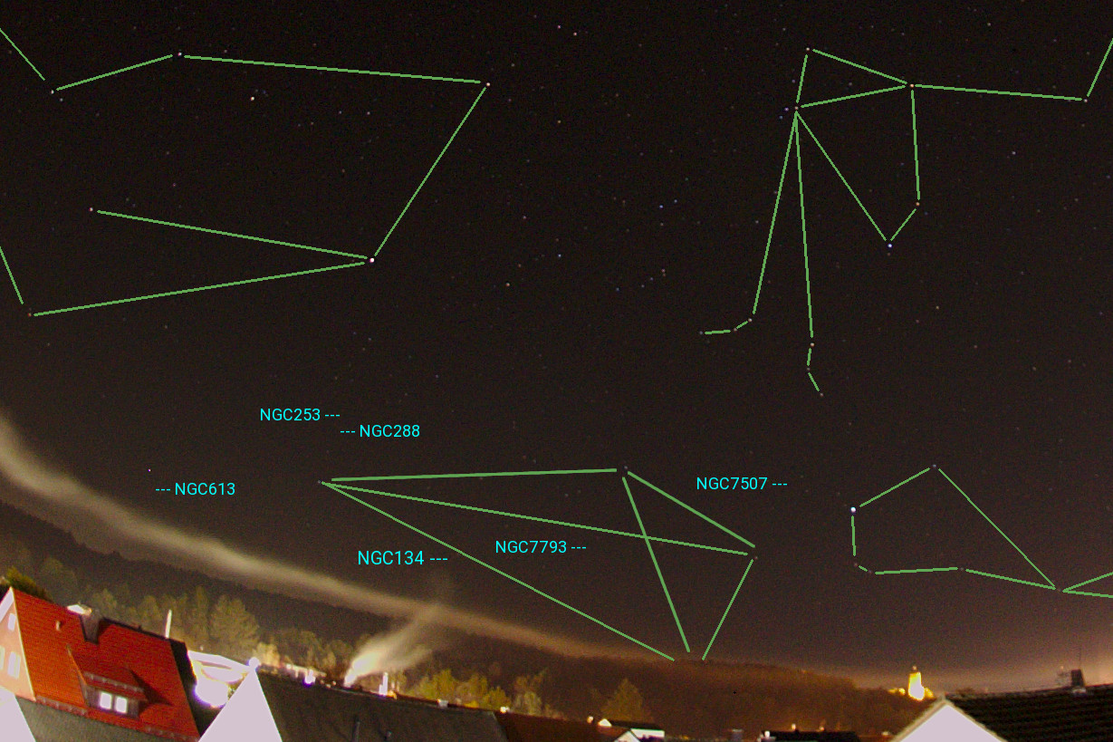 Die scheinbaren Helligkeiten der Sterne sind im Bild rot markiert und in Magnituden angegeben.