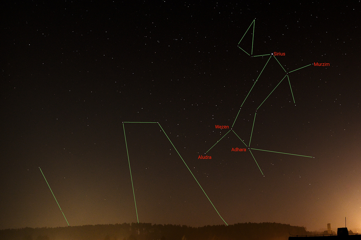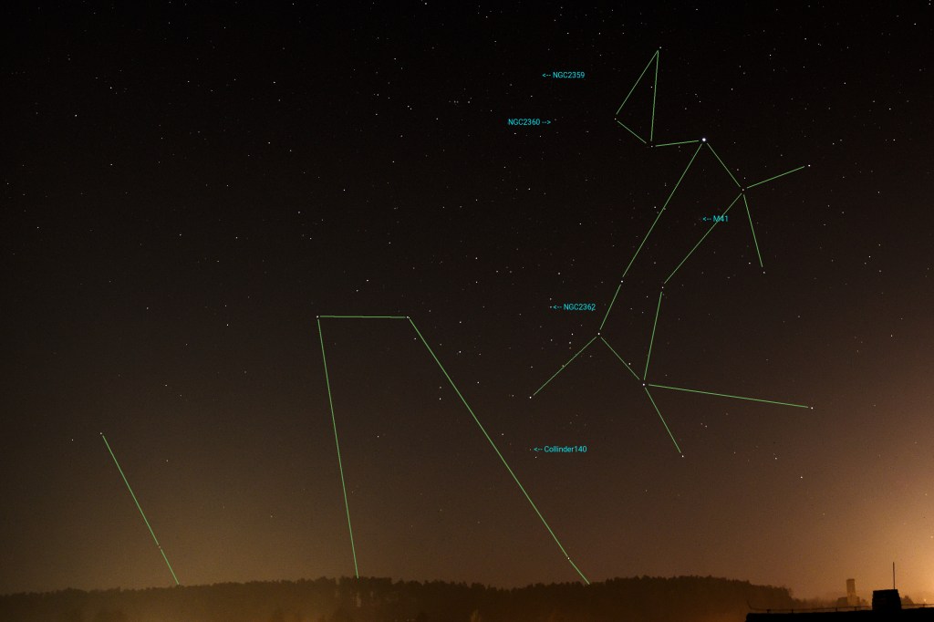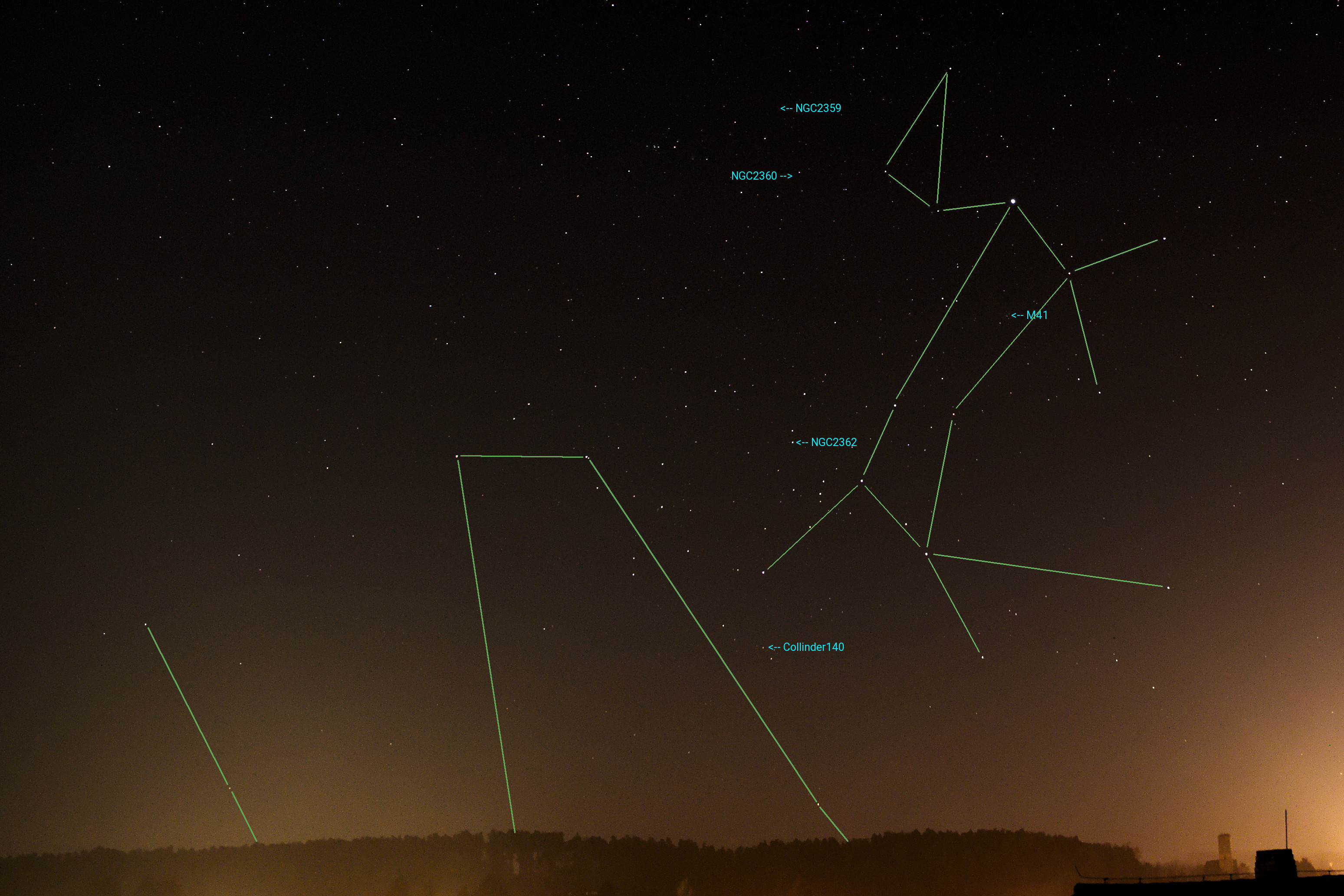 Die scheinbaren Helligkeiten der Sterne sind im Bild rot markiert und in Magnituden angegeben.