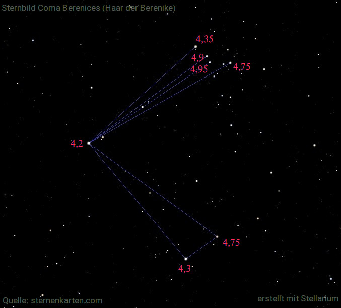 Die scheinbaren Helligkeiten der Sterne sind im Bild rot markiert und in Magnituden angegeben.