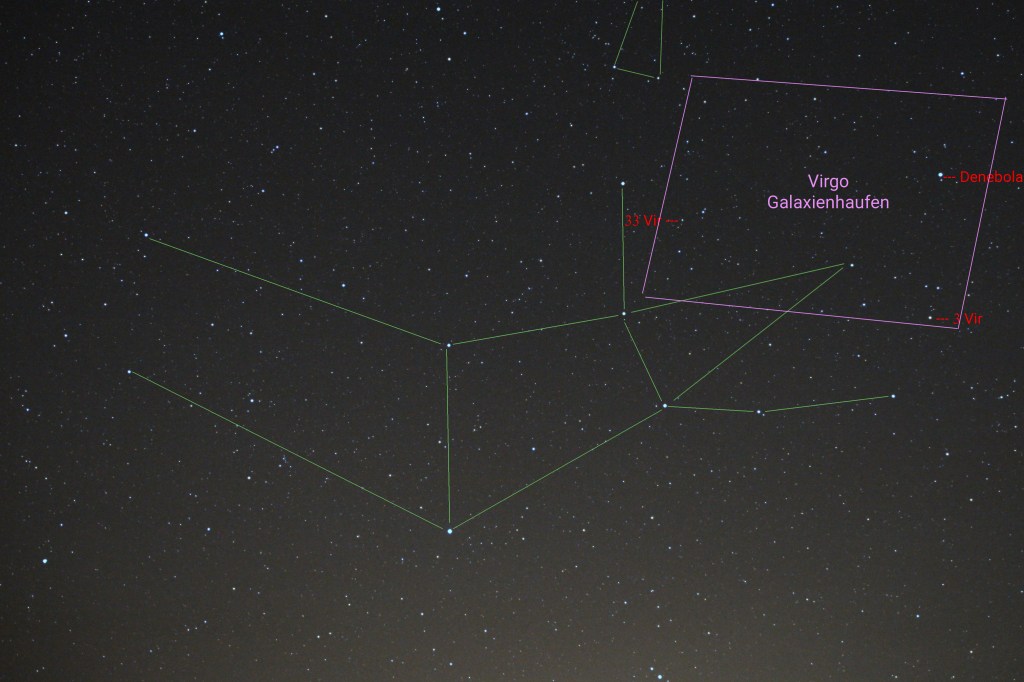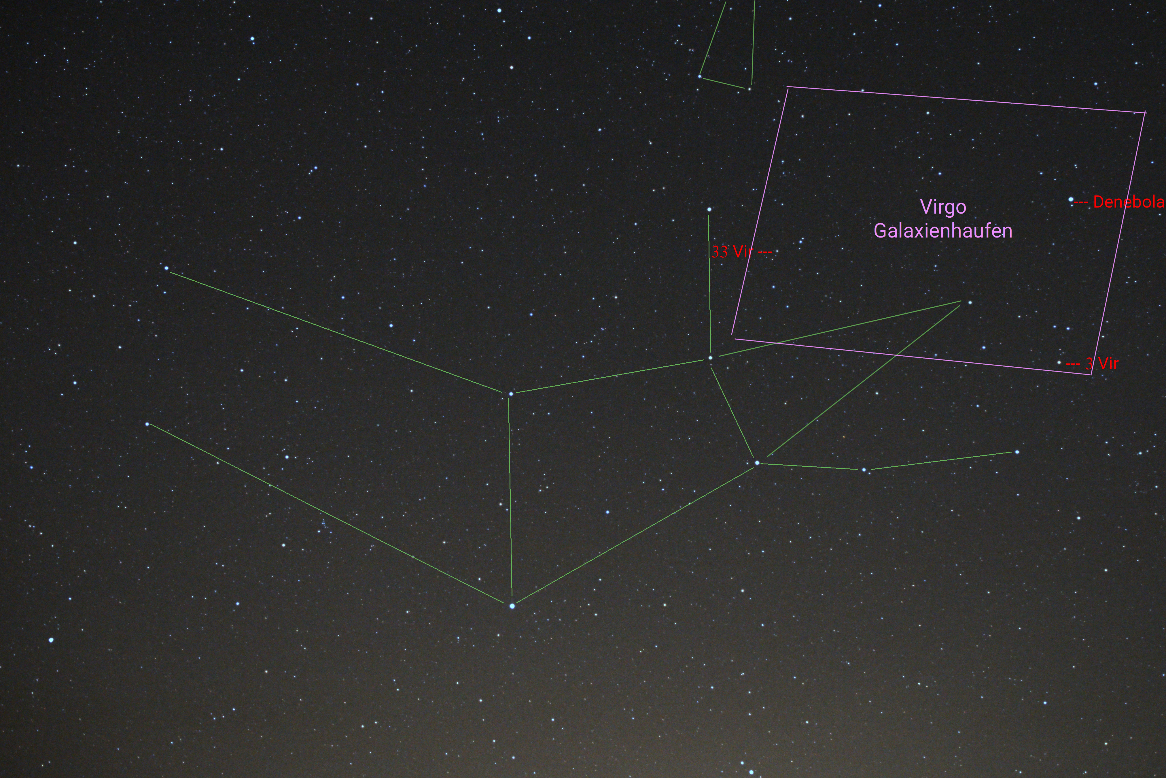 Der untere Teil des Virgo-Galaxienhaufen-Fotos beinhaltet die Galaxien des Sternbildes Jungfrau, die zum Virgo-Galaxienhaufen gehören. Diesen unteren Teil hab ich ausgeblendet. Er kommt bei Sternbild Jungfrau zum Zug.