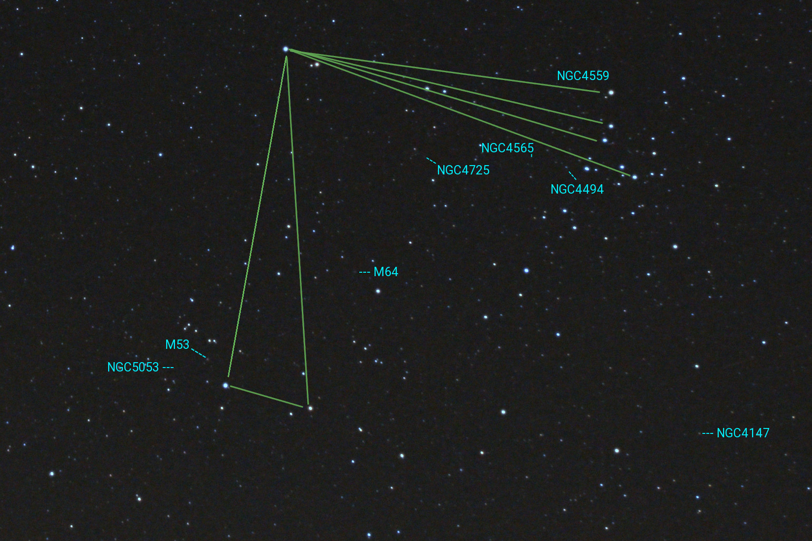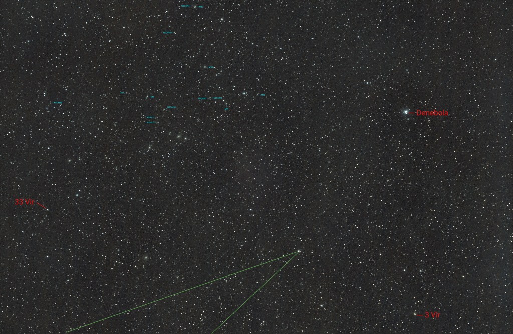 Im oberen Teil des Fotos befinden sich die Galaxien des Sternbildes Haar der Berenike, die zum Virgo-Galaxienhaufen gehören..