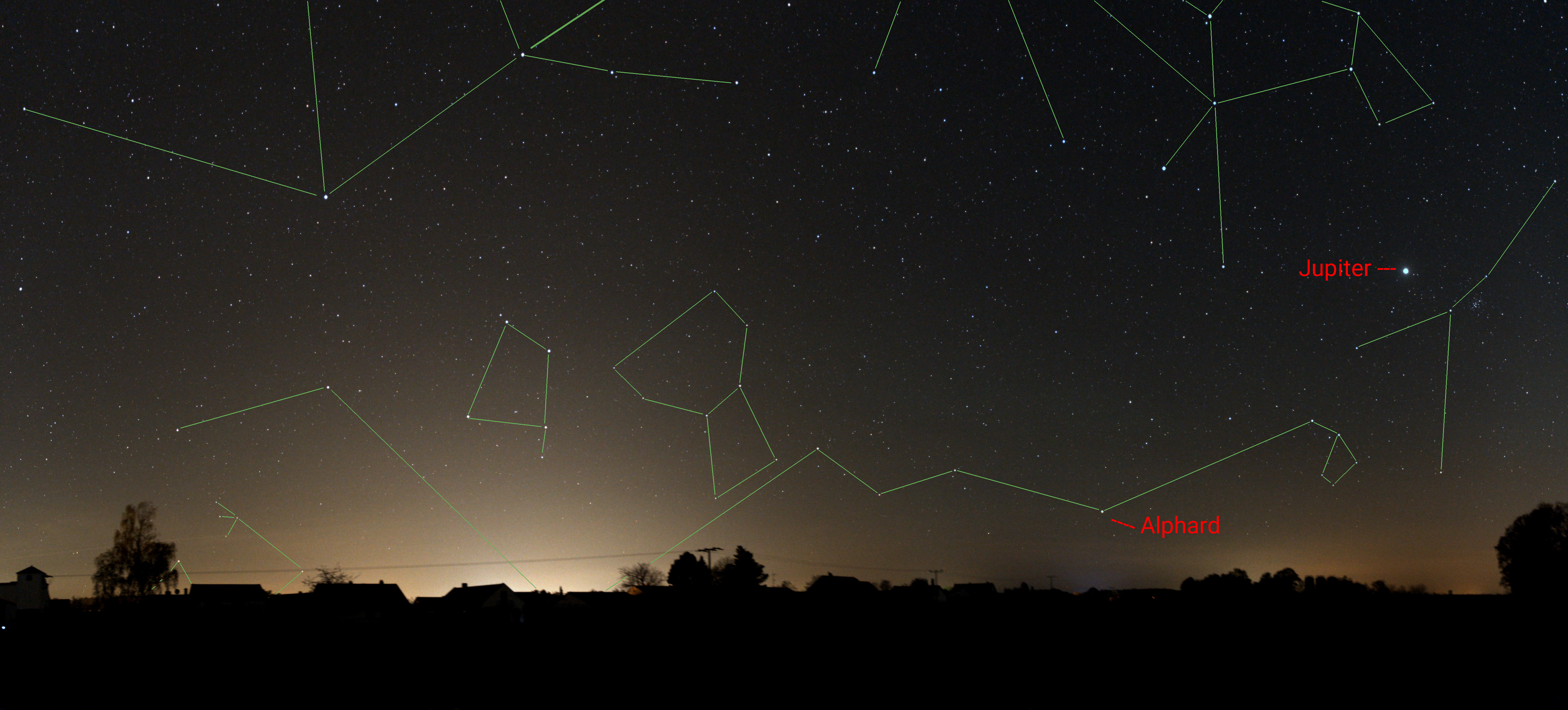 Die scheinbaren Helligkeiten der Sterne sind im Bild rot markiert und in Magnituden angegeben.